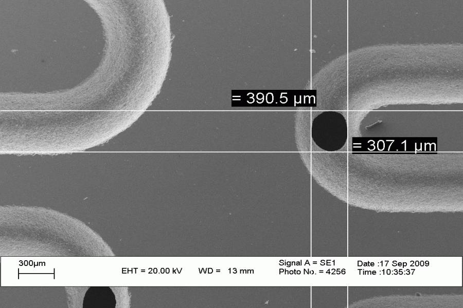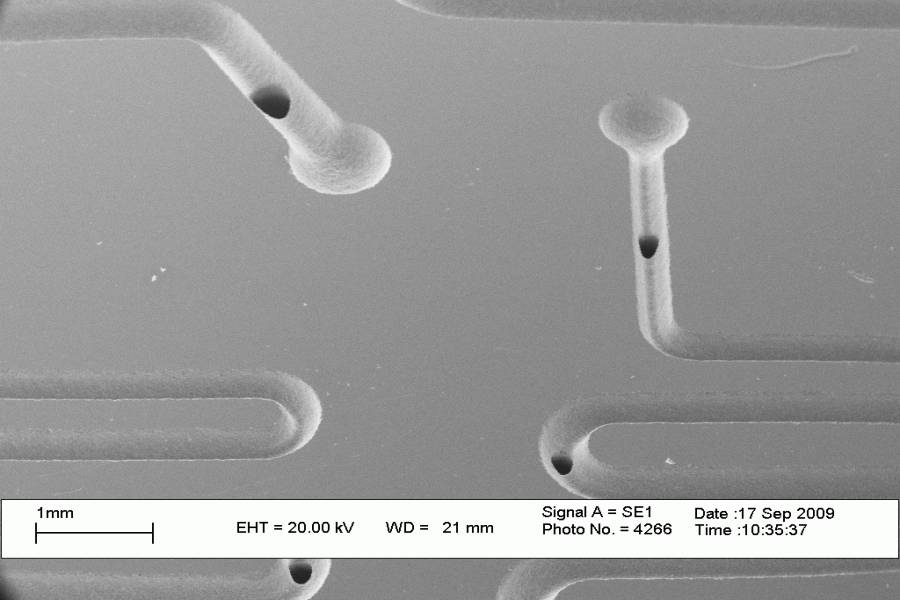 Crystal Mark’s micro-abrasive blasting technology has the required precision and control to core all types of wafers required by semi-conductor manufacturers and biomedical engineering companies. It also has other applications, including etching patterns, features, fiducial targets, vias, or holes and pockets into all types of semiconductor materials.