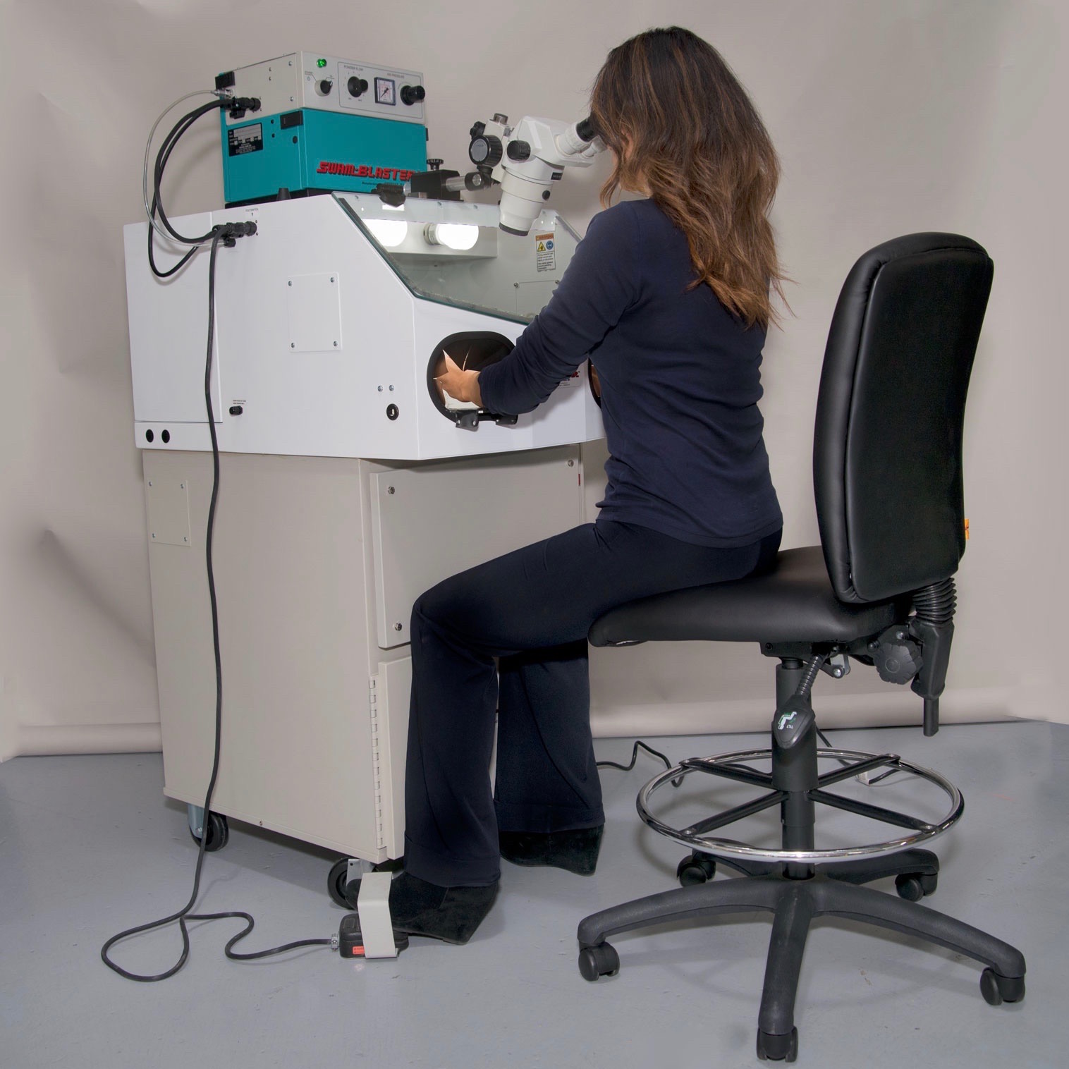 This Stand-Alone Work Cell has a spacious work area with a high volume dust collector and storage cabinet. It is on casters for easy portability. It also features an outlet on the top of the work chamber to accommodate any table top Micro SWAM-blaster® (Any Model EV or MV).